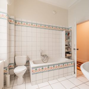 Un couloir dessert respectivement une deuxième chambre, une salle de bains, une salle d’eau, un WC indépendant, la cuisine (avec balcon), puis une troisième et quatrième chambre.