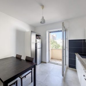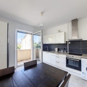 – une grande cuisine récente et son coin repas, avec son balcon attenant donnant sur l’arrière vers le square de Chalampé