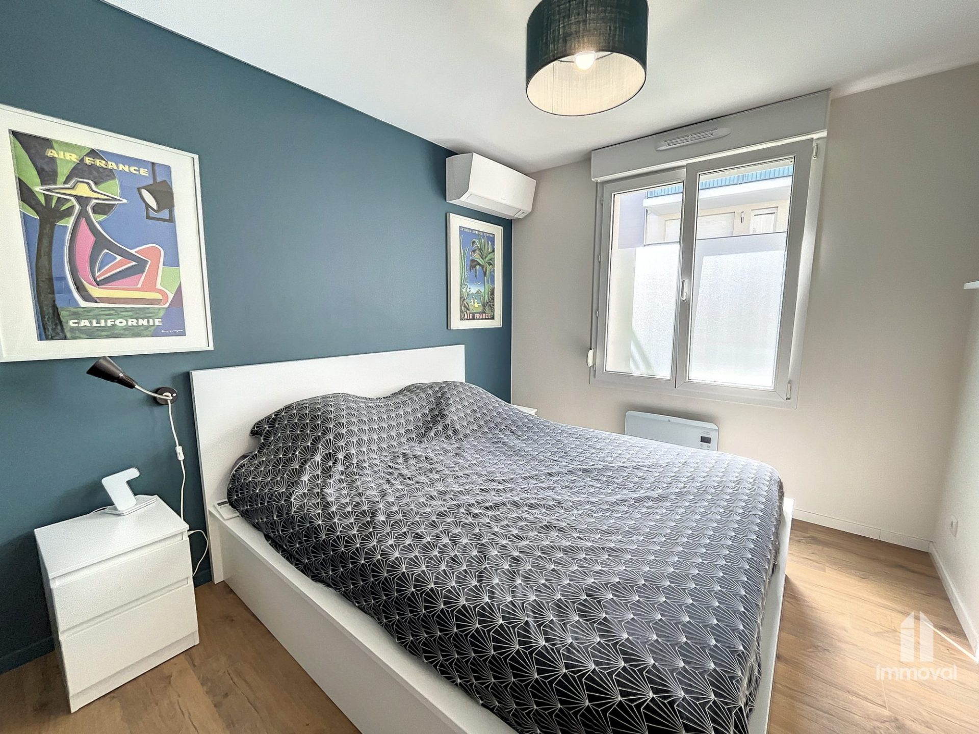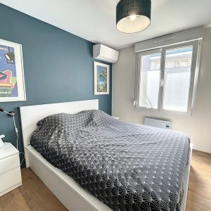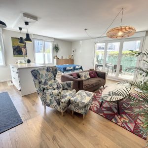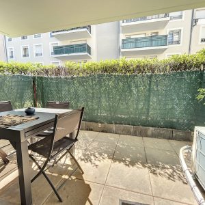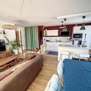 Une entrée, une cuisine équipée et ouverte sur le séjour donnant accès à une terrasse de 8m2 orientée Sud, deux chambres, une salle de bains et un WC séparé.