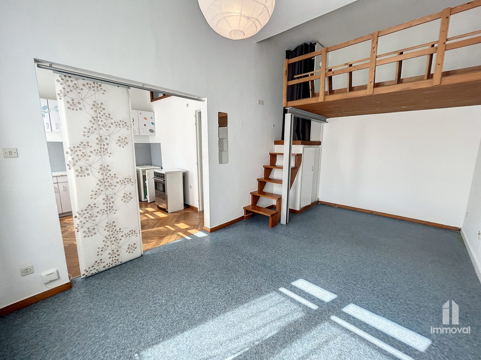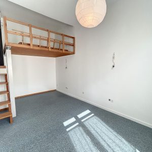 une entrée, une salle de bains avec toilettes, une cuisine équipée, une chambre avec mezzanine.